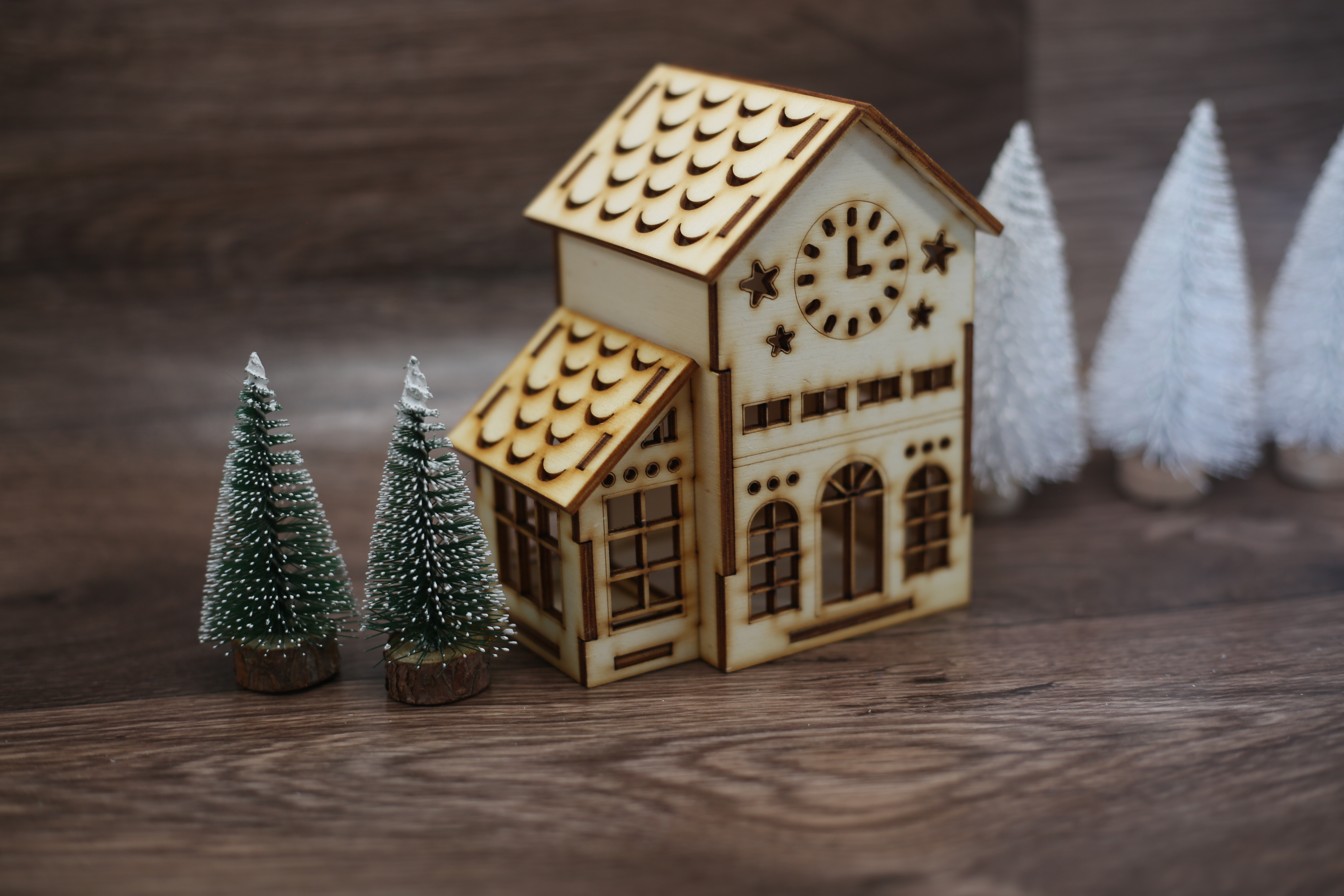 Prírodný, nebrúsený a nefarbený domček, je z preglejky 3mm hrubej.13 cm vysoký.