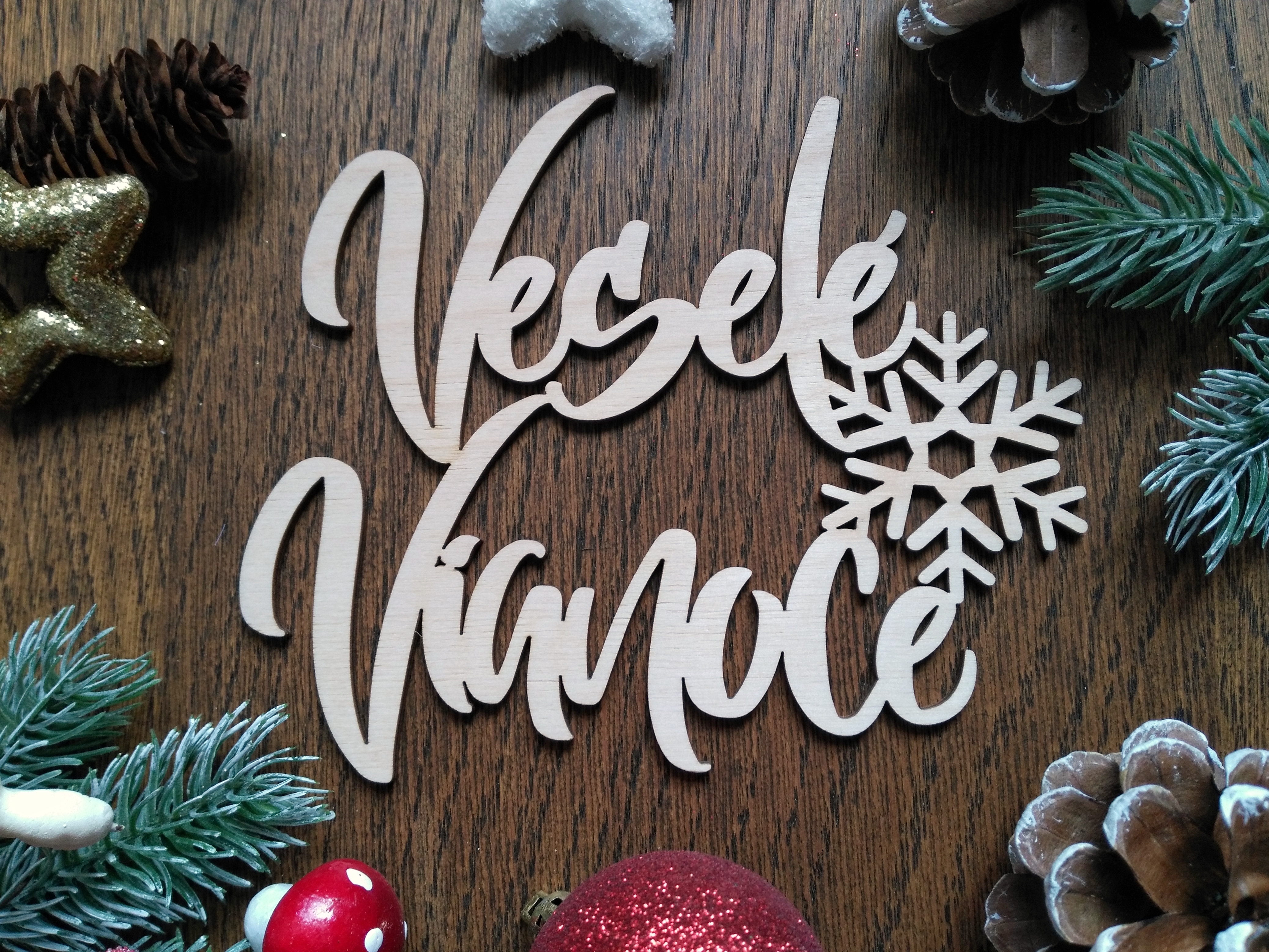 Vianočný výrez Veselé vianoce je z 3 mm hrubej preglejky vhodný na ďalšie dotváranie vencov a veľa iného.