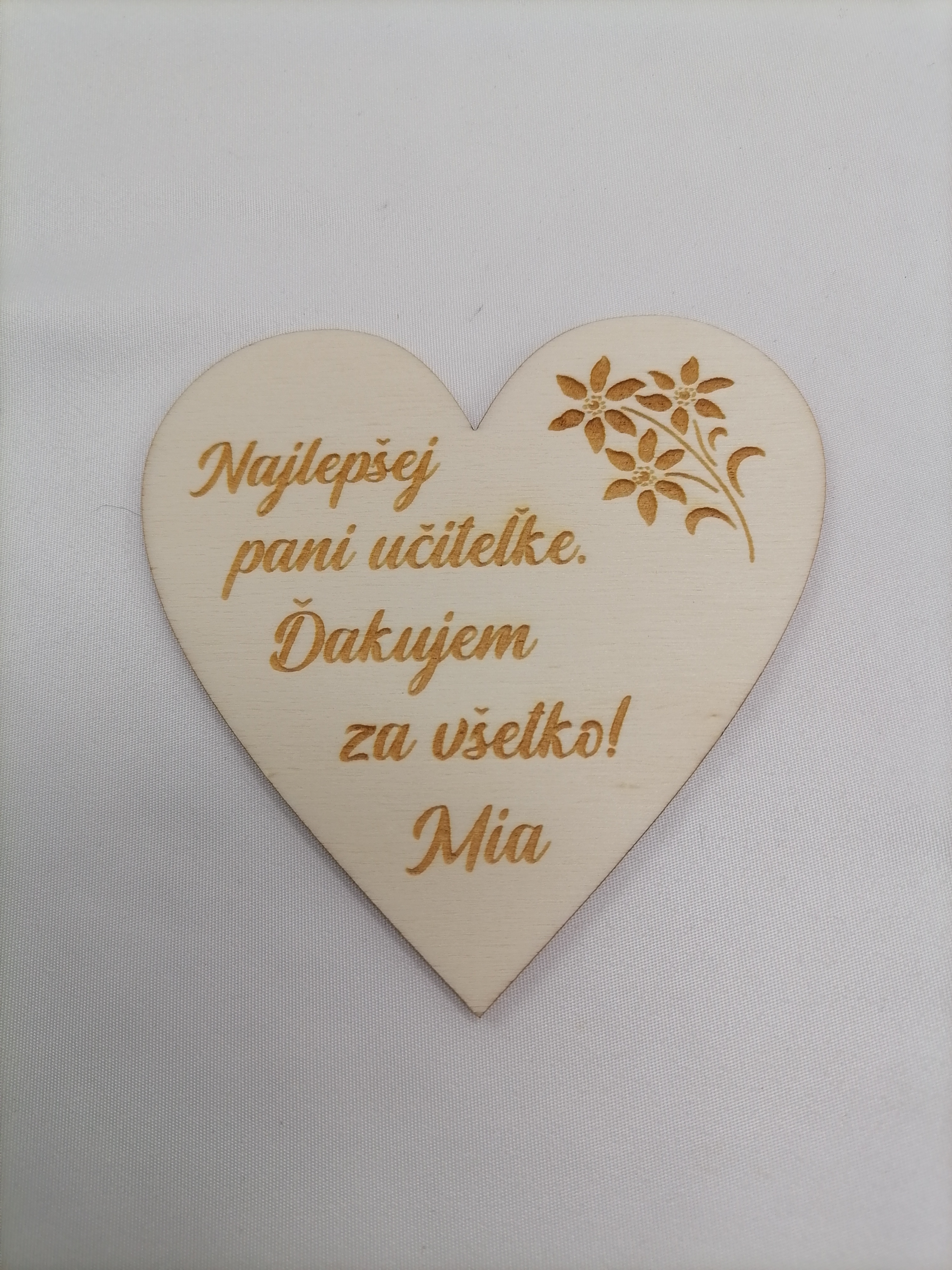 Magnetka, srdiečko bez červeného srdiečka pre pani učiteľky od žiakov ako darček. Gravírovaný text je iba tento plus vaše meno ktoré nám prosím napíšte do poznámky. Materiál je 3 mm hrubá topoľová preglejka. Vhodné ako darček :) na pamiatku, cena je za 1ks