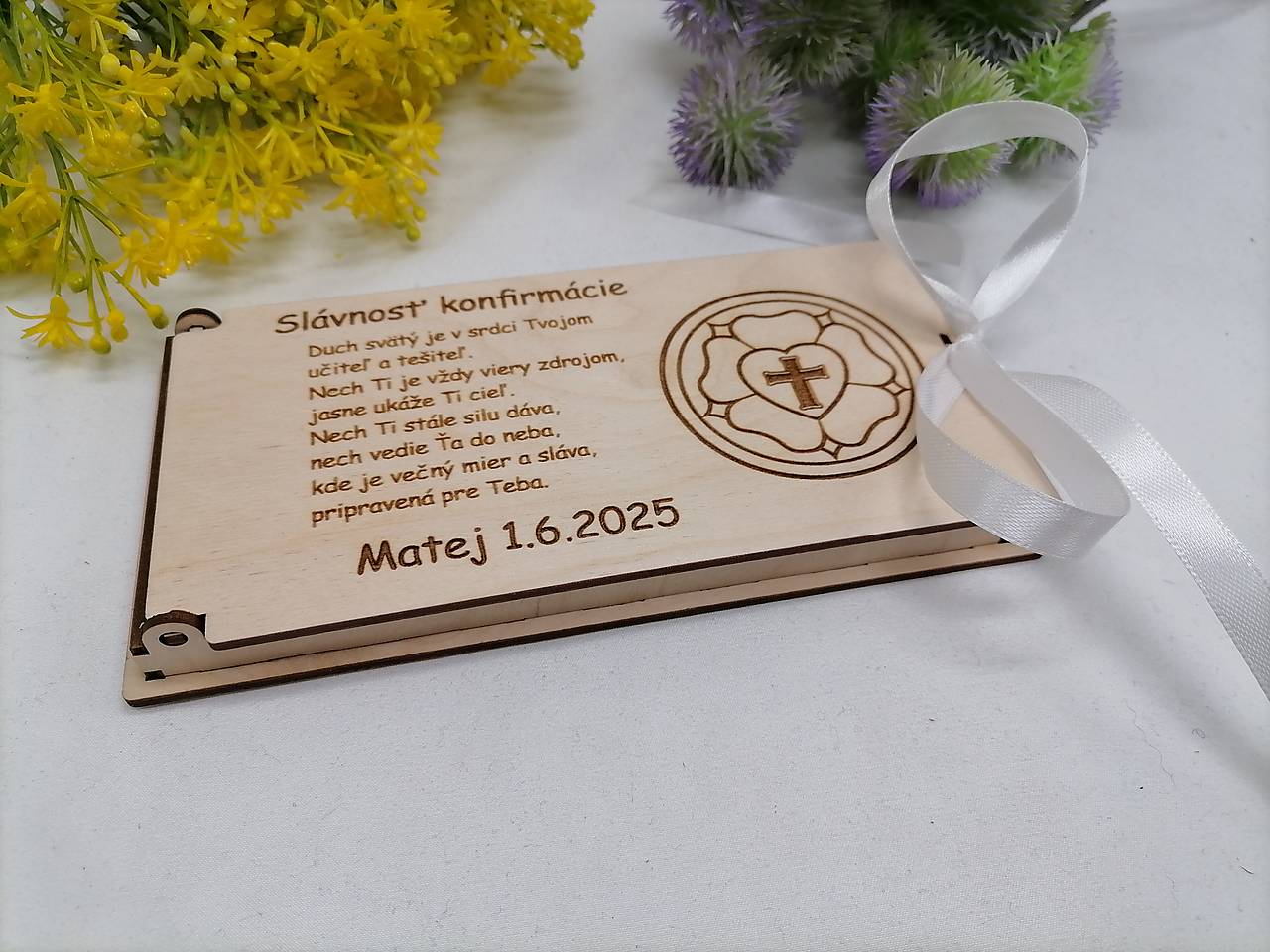 Obálka na slávnosť konfirmácie. je vyrobená z 3 mm hrubej preglejky. Dávame bielu stuhu.. Prosím meno a dátum nám napíšte do poznámky a ak treba tak tiež venovanie do vnútra od koho chcete darovať peniaze.
