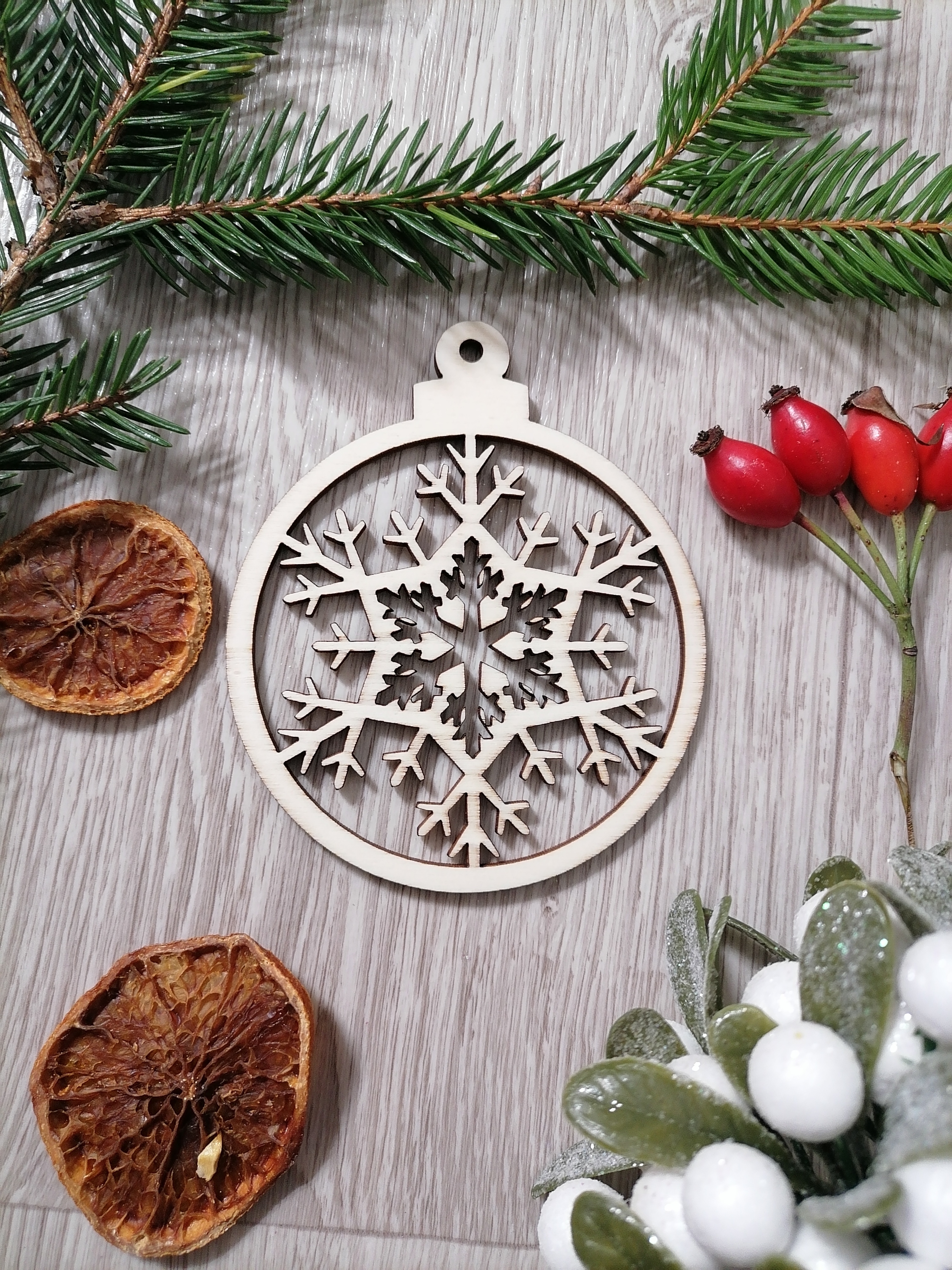 Vianočná prírodná ozdoba z dreva z 3mm hrubej preglejky - guľa s vločkou.
