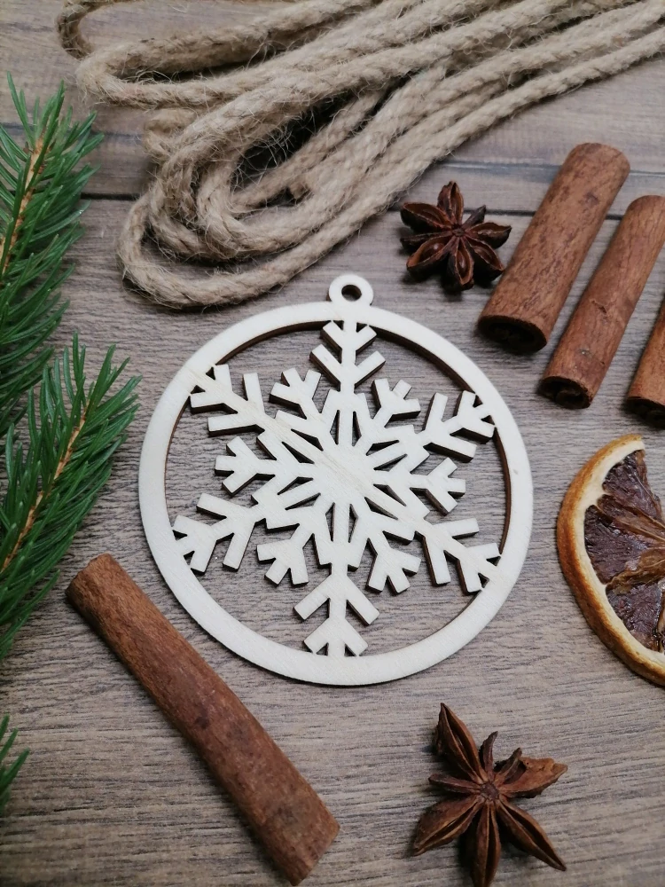 Vianočná prírodná ozdoba z dreva z 3mm hrubej preglejky - guľa s vločkou.